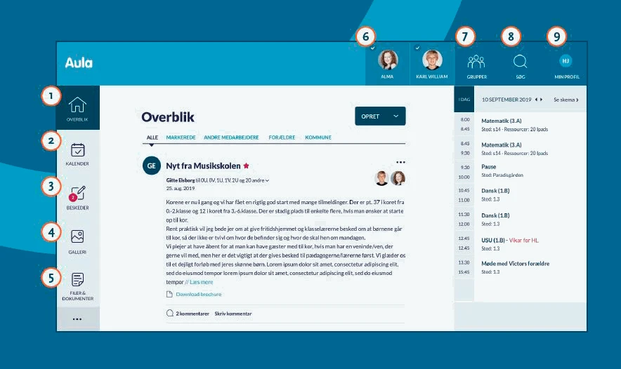Her ser du skema og begivenheder fx samtaler og arrangementer. - Beskeder